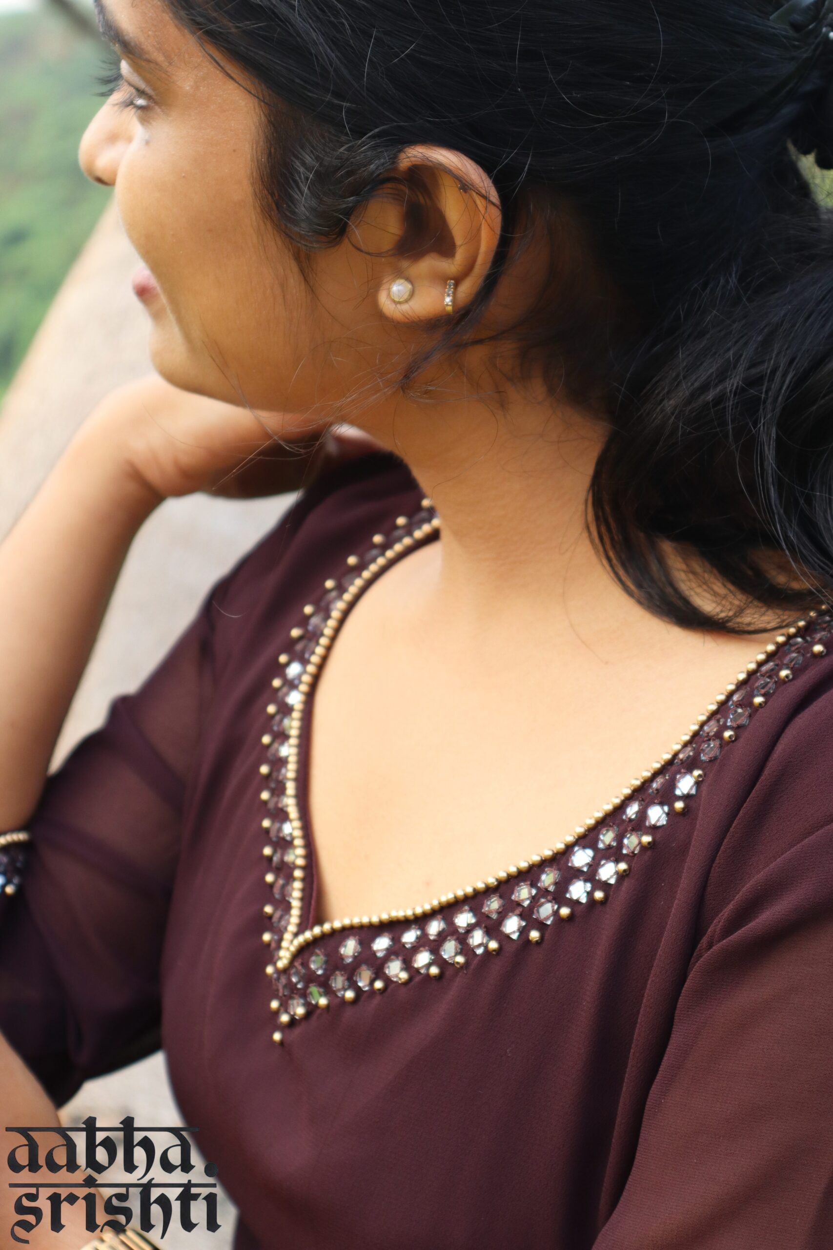 Sleeves: Three-quarter sleeves with front slits. The sleeve edges are decorated with matching mirror and bead work, making them the standout detail of the design.