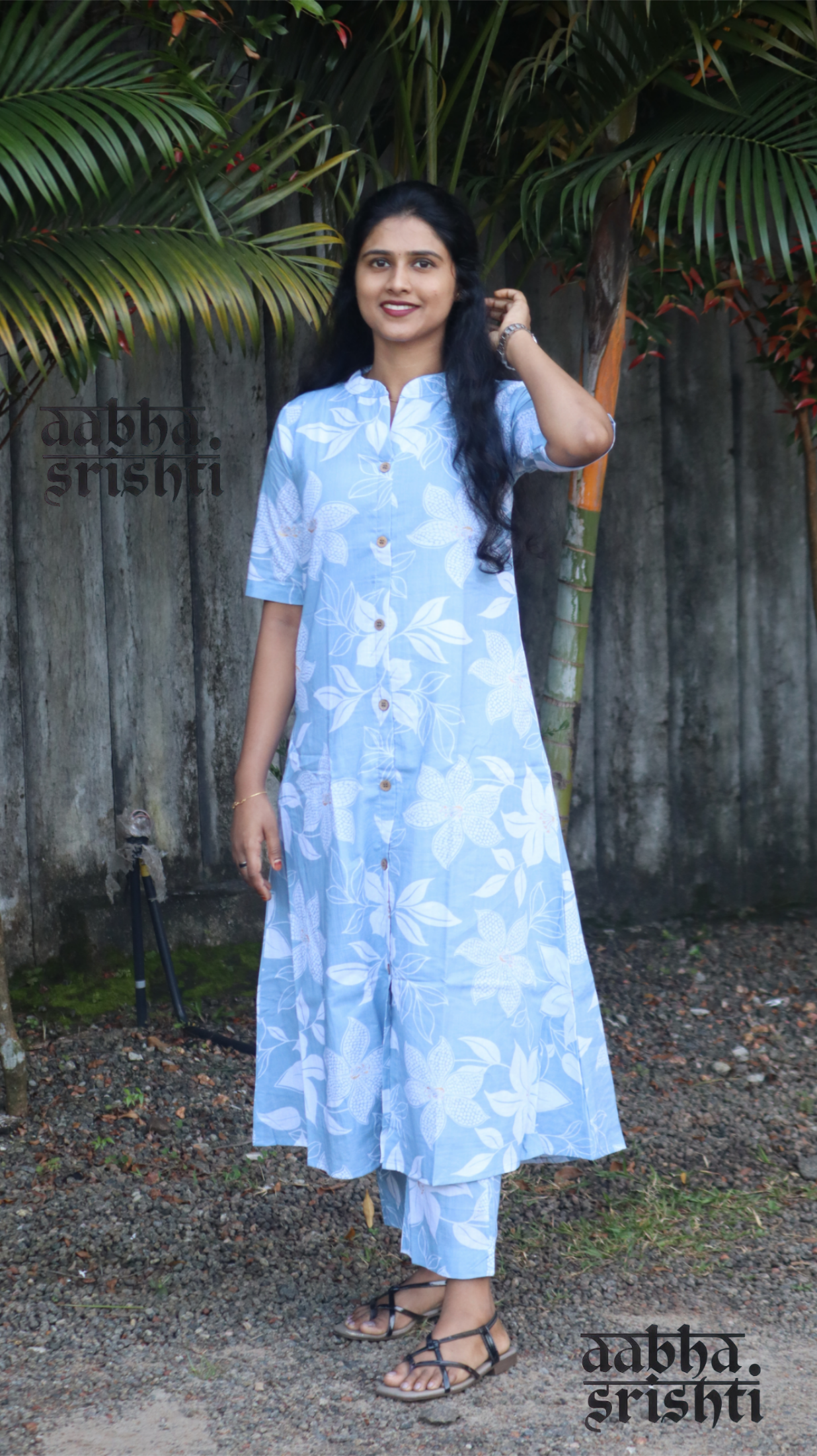 Fabric & Print: Made of soft, breathable cotton fabric with an all-over white floral and leafy print, giving it a fresh and summery vibe.