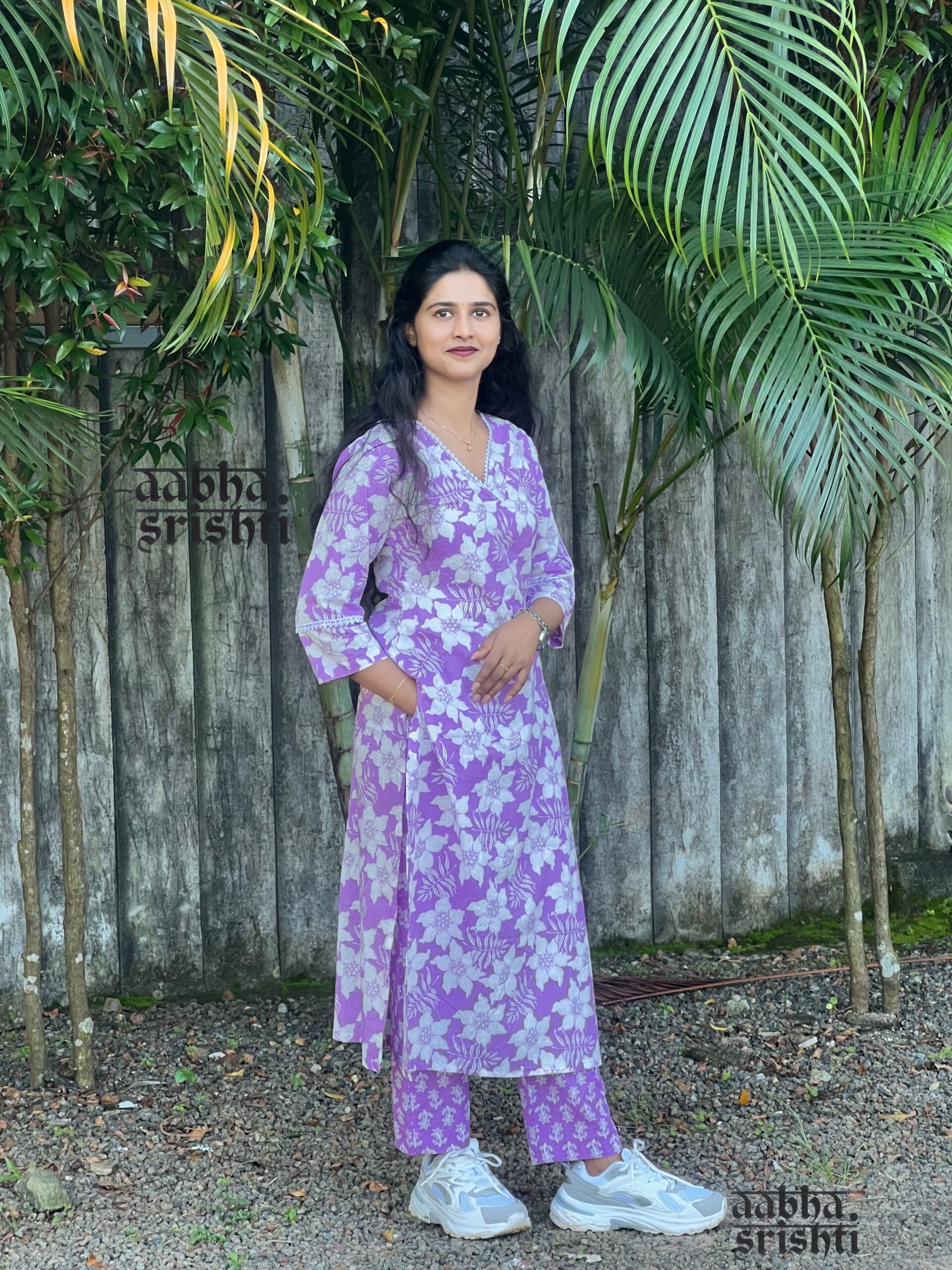 Fabric & Print: Made of comfortable cotton blend fabric with an all-over white floral print against a lavender background, giving it a soft and summery look.